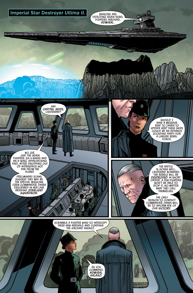 First however it's over to Ab Dalis. This opening part of the issue deals with a pretty incredible battle in the skies above the ruined planet. There's plenty of that classic Star Wars feel as Starlight Squadron engage the Star Destroyer and its TIE Squadron as they attempt to destroy the Rebel fortification. It's a great action packed issue as Ramon Rosanas packs every scene with plenty of close-ups which guides the ferocity of the battle at hand.